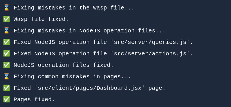 In the prompt, we would usually repeat the same guidelines we provided previously in the Generation step, while also adding a couple of additional pointers to common mistakes, and that usually helps, it fixes stuff it missed before. But, often not everything, instead something will still get through. Some things we just couldn’t get it to fix consistently, for example, Wasp-specific JS imports, no matter how much we emphasized what it needed to do with them, it would just keep messing them up. Even GPT4 wasn’t perfect in this situation. For such situations, when possible, we ended up writing our own heuristics that would fix those mistakes (fixing JS imports).