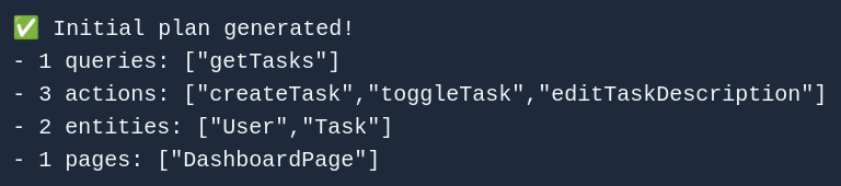 Once given an app description and title, the code agent first generates a Plan: it is a list of Entities, Operations (Queries and Actions), and Pages that comprise the app. So kind of like an initial draft of the app. It doesn’t generate the code yet → instead, it comes up with their names and some other details, including a short description of what they should behave like.
