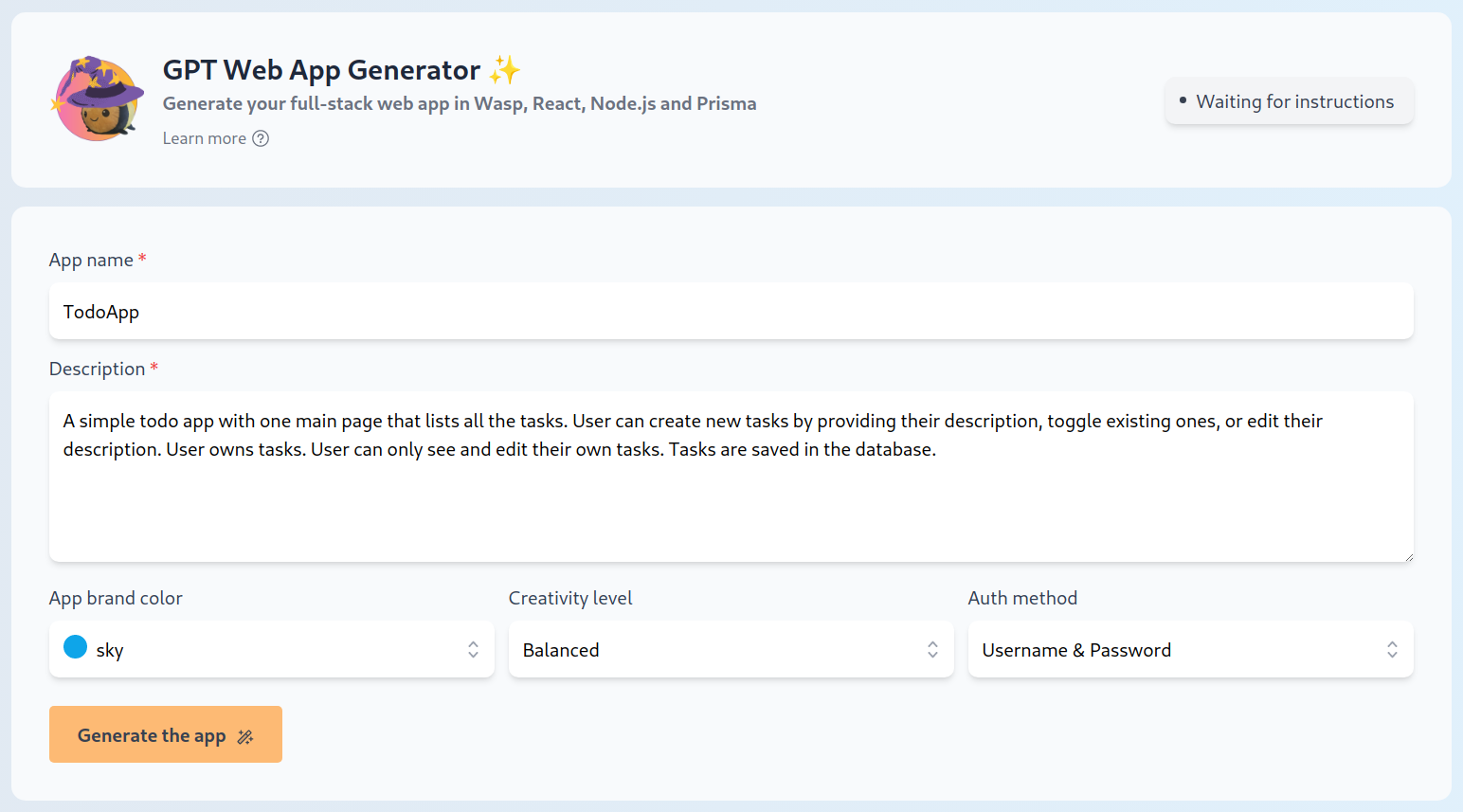 We started this as an experiment, to see how well we could use GPT to generate full-stack web apps in Wasp, the open-source JS web app framework that we are developing. Since we launched, we had more than 3000 apps generated in just a couple of days!