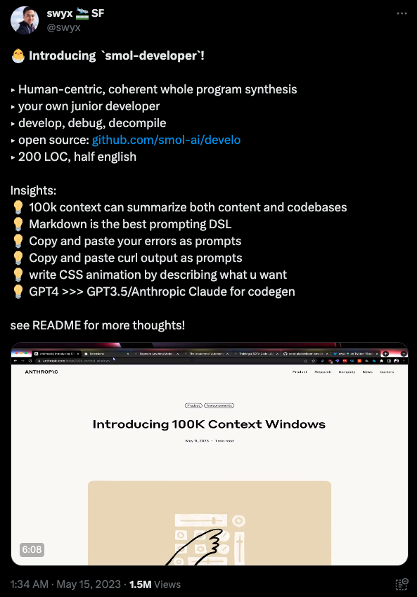 Smol-Developer quickly gained notoriety by being one of the first of such tools on the scene, in addition to Swyx’s prominence within it. So if you’re curious to see what’s being built with it, just check out some of the numerous YouTube videos on it.